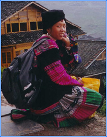 龙胜到了!就在我们下车一会儿,很多当地妇女像一阵风地把我们给围住了。她们穿着粉红刺绣的短上衣、黑底镶彩边的短裙,热心地帮我们把行李放进她们的筐里。