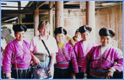 早上九点,村里的妇女带上她们的刺绣商品和背包,形成一条粉红与黑相间的队伍,我们跟着她们一起离开村子,上布满梯田的山。那路就如锯齿般参差,不过多数还算比较直。一路上根本没有什么时间留下来休息,这些瑶族妇女从25岁到70岁不等,个个身材健美,比我们强多了,因为她们天天都是这么走着去工作的,完全不需要停下来擦擦汗、喝口水或是呼吸一下空气。