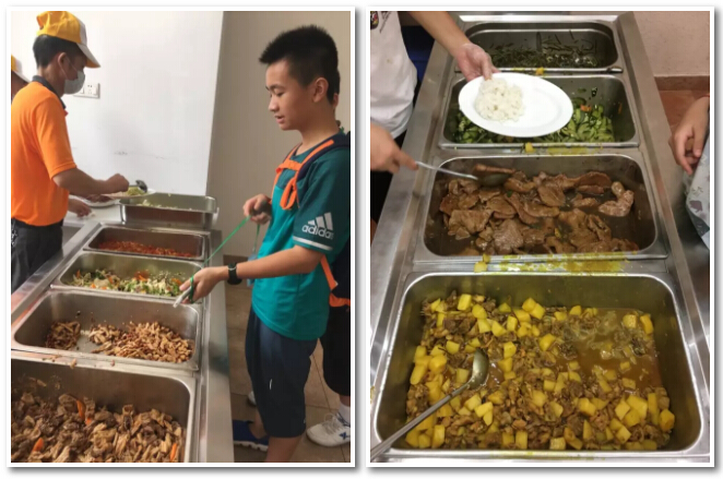 夏令营期间的饮食提供是来自连续五年合作的香港上市餐饮公司+平和英语村自有食堂,早中晚餐丰富营养,荤素搭配合理,同时考虑到少数民族、四川、西北地域学员口味,提供当地美食,正餐六菜2汤2主食。