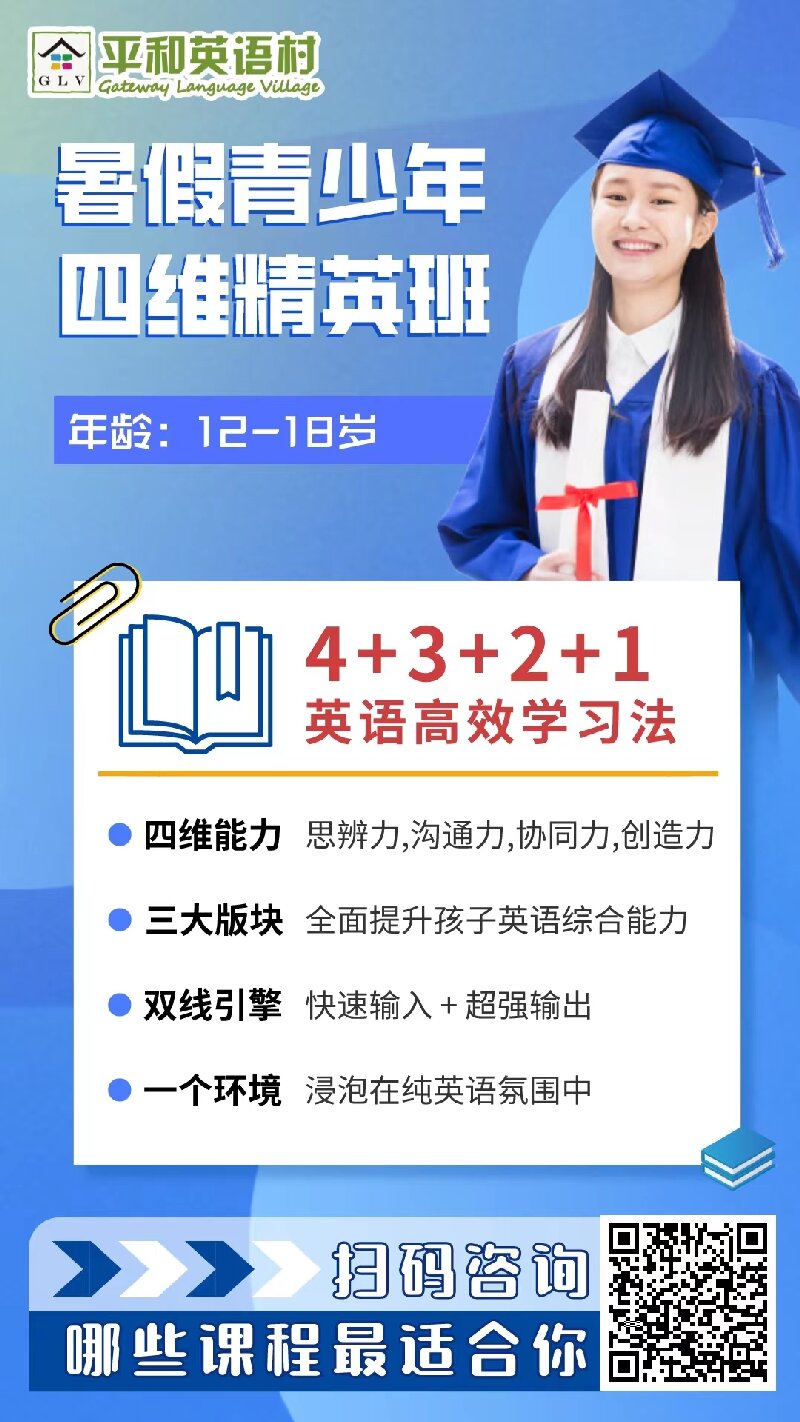 推荐平和英语村的四维精英课程,它让学员在纯英语的环境搭建英语思维,培养阅读素养与国际领导力,提高21世纪人才所应具备的 “批判性思维,创造性,沟通和协同合作”的能力,让每位学员在快乐学习中提高英语应用能力,成为高能人才。所有的知识积累、语言技能学习都是为了“用英语”,“学-练-用”的课程设置闭环,将英语自然融入生活,成为学生逐步成才的沟通武器。